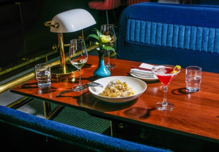…reads the gold lettering on the glass doorway. Inside the white-tiled entrance, another mysterious sign: “Please fix your hair and remove the mud from your boots.” Intrigued, we climb a tall staircase and step through parted curtains into Kissa Tanto, a sultry supper club from another time. It’s a place of glossy coved ceilings and gleaming brass bankers’ lamps casting a dim glow over peachy-rose bar stools. On the stereo, Japanese pop star Izumi Yukimura sings along to a swingy cha-cha-cha. Waitstaff in skinny black ties ferry beguiling plates of tobiko bruschetta and wakame tortellini through a stylish crowd that seems slightly—delightfully—stunned.