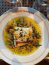 But no place on the list above pleased us so emphatically as did Camille, at the entrance to the market. Both the atmosphere and the cooking (from Elliot Hashtroudi, ex-St. John) were a delight. As the playlist veered from Steely Dan to Faces, my wife (sensibly) enjoyed a pretty salad of burrata with young beets, favas and pea shoots, while I tucked into a plate of calf’s brain, luscious, creamy, thickly sliced and doused in beurre noisette. There were stout spears of white asparagus dressed with black butter. A sublime chop of heritage pork came with frisée, and young radishes showered with shaved Comté. And the John Dory was sauced with an exquisite emulsified chorizo butter. To finish, choux pastry filled with kumquat cream. When we return, Camille will be our first meal stop.