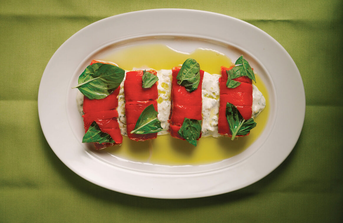 To assemble, spoon 50 g (3 oz) of trout into each pepper and roll up. Serve the peppers over a creamy vinaigrette (emulsified with egg yolk) enhanced with chopped olives, capers, shallots, oregano and celery leaves.