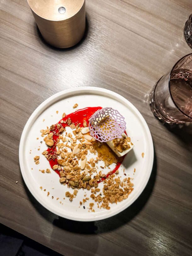 Spruce tip panna cotta, haskap berry granola, maple syrup