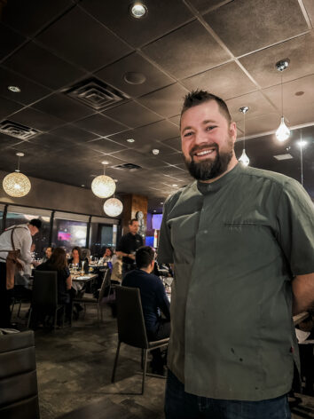 Perch chef Justin Champagne-Lagarde (left) with host chef Brent McAllister of AquaTerra