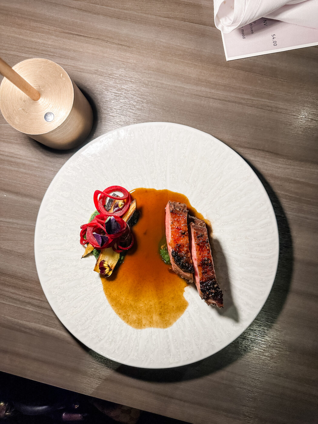 Shio koji-marinated, sous-vide duck breast with roasted parsnip, sea lettuce sauce, pickled beet strings, wild leek purée
