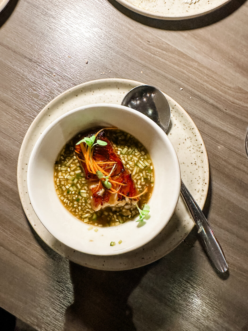 Unagi-style marinated black cod, charcoal-grilled, with chawanmushi, charred cucumber broth, cucumber brunoise, carrot, Thai basil