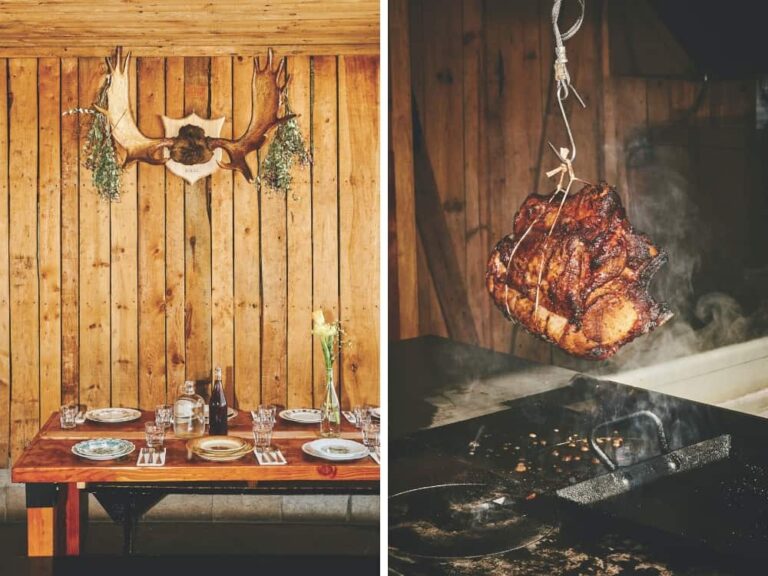 Remember, we are in a chalet-cum-sugar-shack. Wood panelling and wooden beams everywhere, hunting mounts, animals skins draped over the backs of chairs. But this stove the kitchen team is gathered around is not really a stove but, upon closer inspection, a wood-fired evaporation table. A huge expanse of hot cast iron surface intended for simmering vast pots of maple sap, not prepping tasting menus.But after a quick tour (a glass of wild apple cider and other unique ciders in the cidery, a quick hello to the deer, pigs and chickens) a menu dégustation of sorts was exactly what we had come for. The maple trees had just started to run days previous; the “maple menu” had been launched that very week. In the 36-seat dining room next door, where the floor-to-ceiling windows were half blocked with snow, the picnic-style communal tables were set with vases of tulips and litre bottles of the season’s first syrup, for drizzling at liberty on whatever you like.
